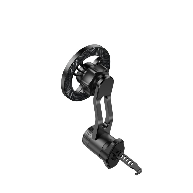 Die Halterung wird an den Lüftungsschlitzen montiert und verfügt über einen beweglichen Arm mit einer 360°-Drehfunktion, die es ermöglicht, das Telefon in jedem Winkel – vertikal oder horizontal – zu positionieren. Darüber hinaus fügt sich die robuste Konstruktion und das minimalistische Design perfekt in das Interieur jedes Autos ein.