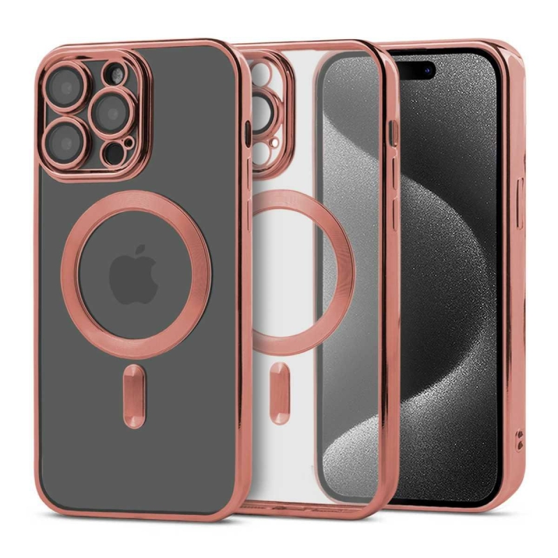 Schutzhülle mit metallisiertem Rahmen, mit integriertem Magneten für das Ladegerät und MagSafe-Zubehör.