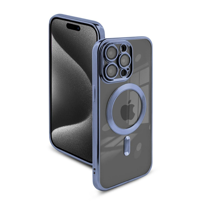 Schutzhülle mit metallisiertem Rahmen, mit integriertem Magneten für das Ladegerät und MagSafe-Zubehör.