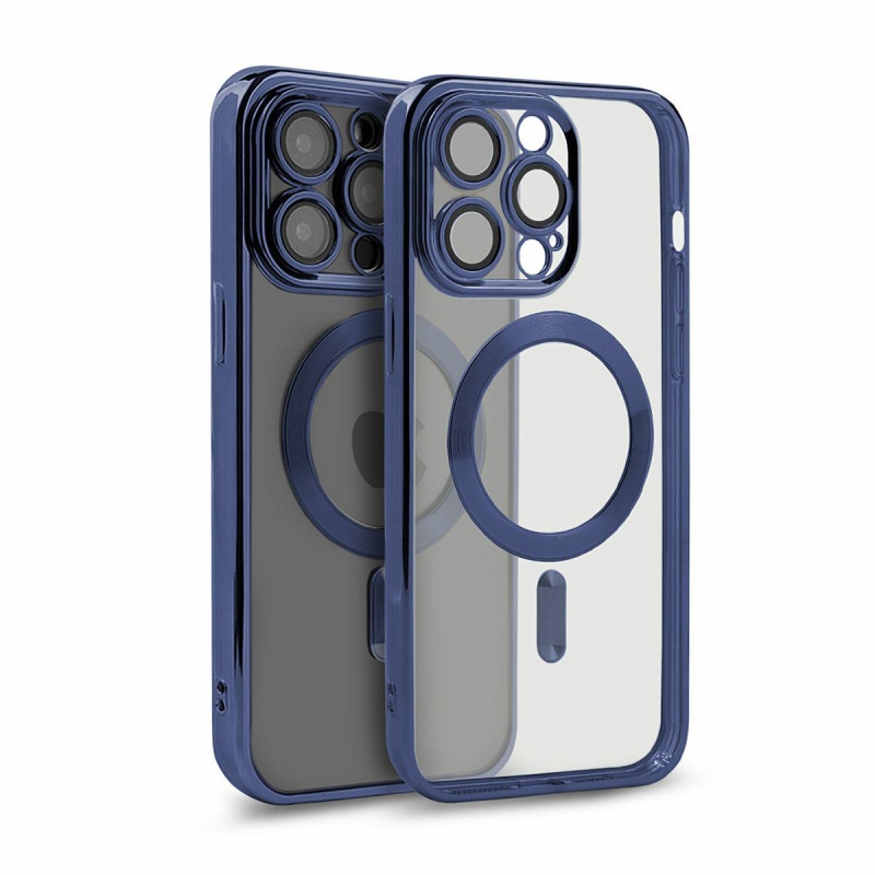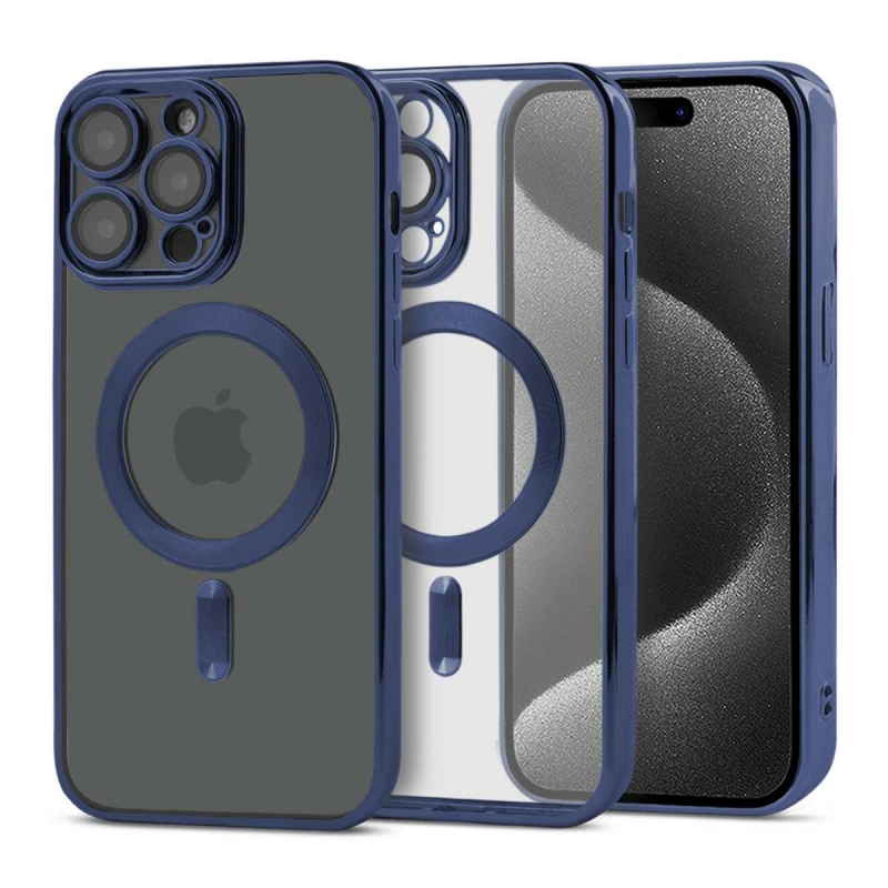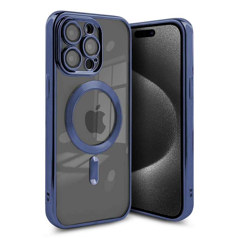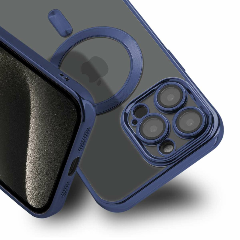 Schutzhülle mit metallisiertem Rahmen, mit eingebautem Magneten für das Ladegerät und MagSafe-Zubehör.