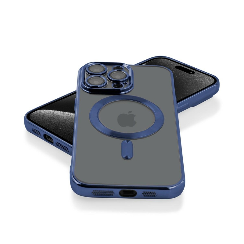 Schutzhülle mit metallisiertem Rahmen, mit integriertem Magneten für das Ladegerät und MagSafe-Zubehör.