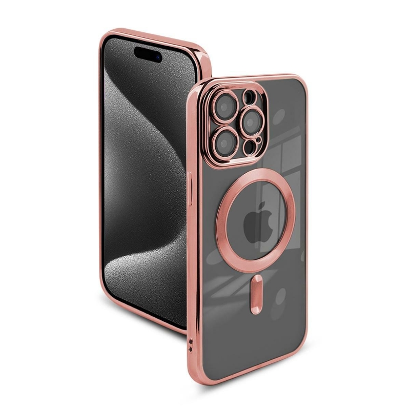 Schutzhülle mit metallisiertem Rahmen, mit eingebautem Magneten für das Ladegerät und MagSafe-Zubehör.