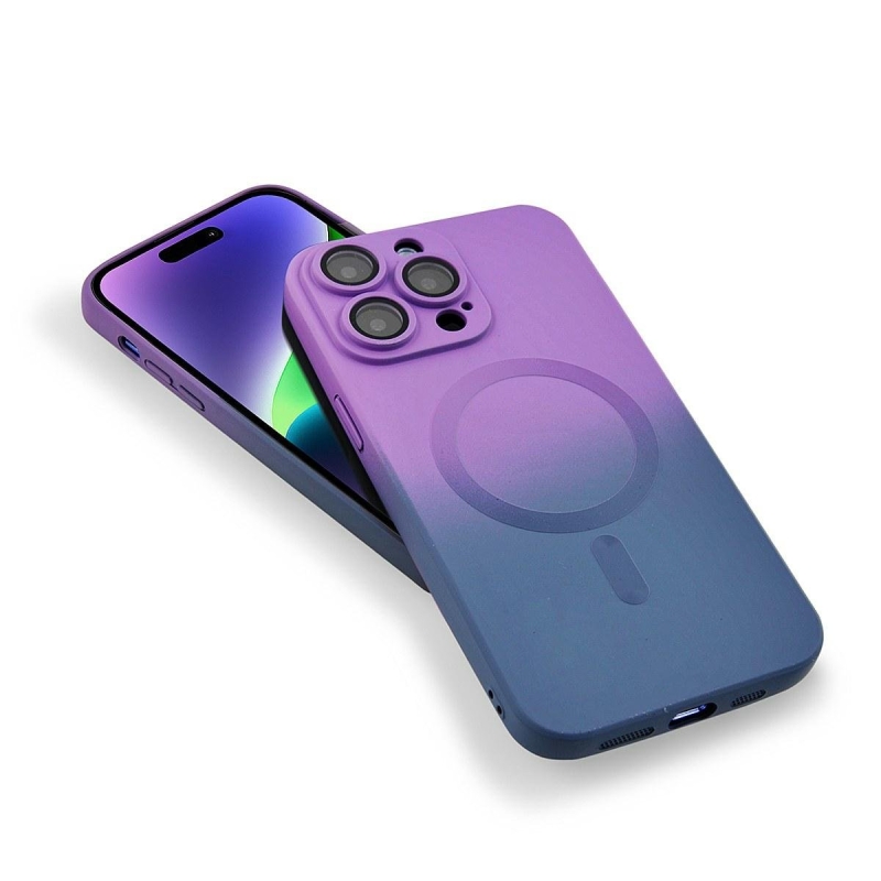 Schutzhülle mit metallisiertem Rahmen, mit eingebautem Magneten für das Ladegerät und MagSafe-Zubehör.