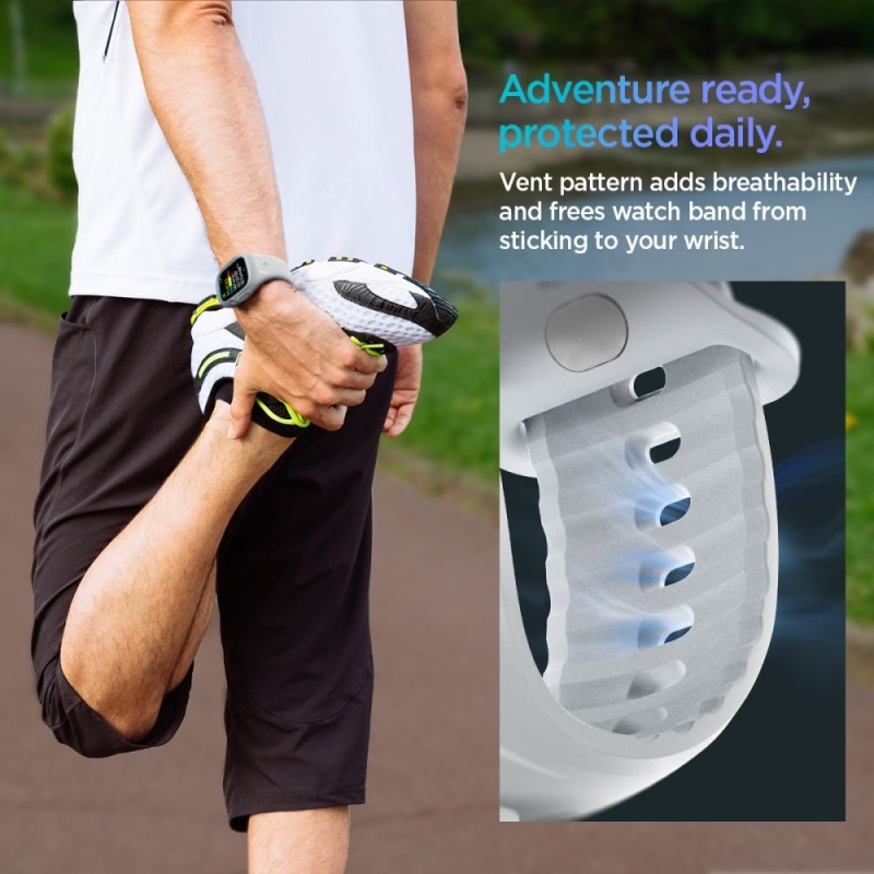 Das Spigen Liquid Air Pro Armband ist eine moderne Lösung, die Stil und Funktionalität vereint. Die integrierte Konstruktion mit dem Gehäuse bietet 360° Schutz – die Uhr ist von allen Seiten geschützt, einschließlich eines Schutzes für die Touch-Oberfläche des seitlichen Knopfs.