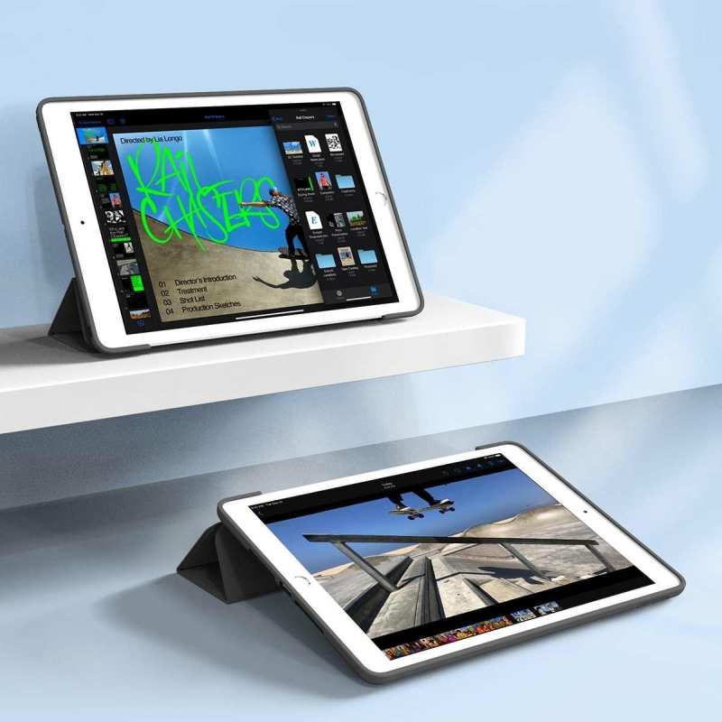 Die klappbare Abdeckung, die den Bildschirm schützt, kann auch als Ständer dienen, um die Nutzung des Geräts zu erleichtern.
