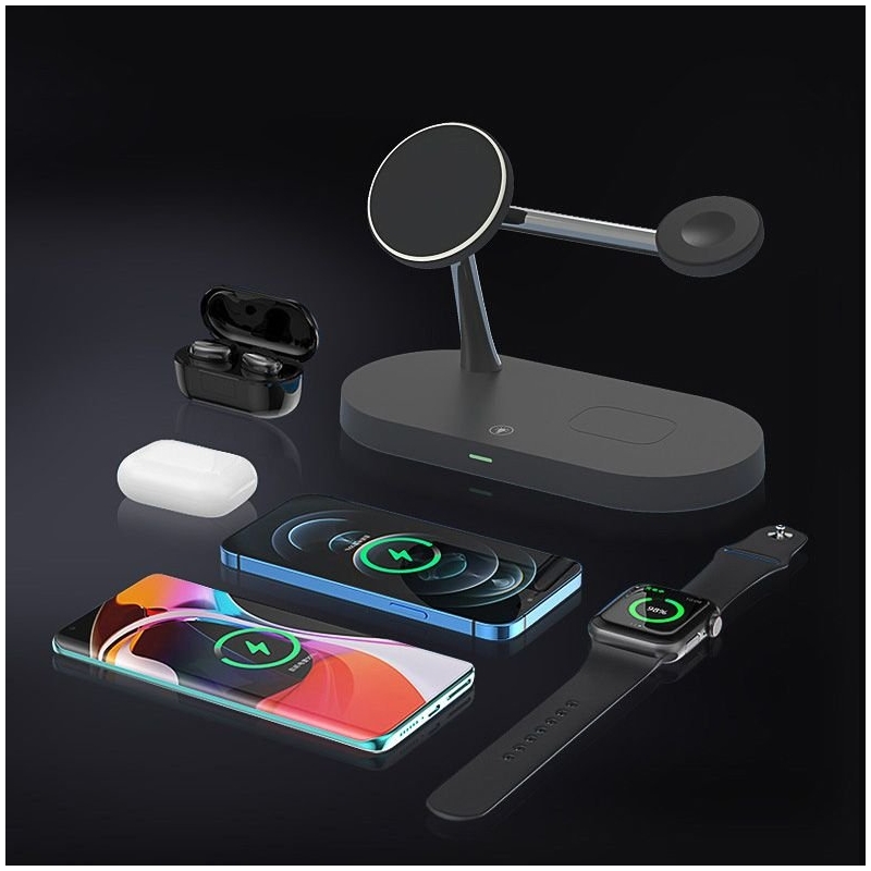 Die multifunktionale induktive Ladestation von Tech-Protect ermöglicht das gleichzeitige oder vollständig getrennte Laden von drei Geräten - iPhone mit MagSafe-Funktion, AirPods und Apple Watch. Das einfache, aber funktionale Design mit mattem Finish verleiht ihm ein sehr ästhetisches Aussehen.