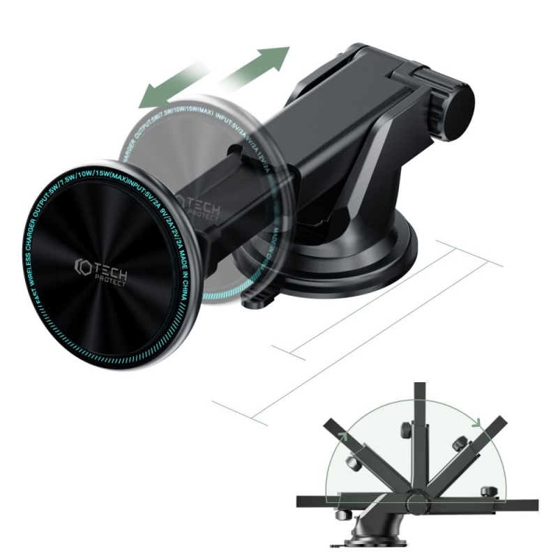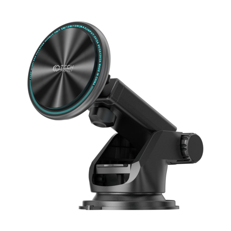 Designer-Autohalterung für das Armaturenbrett Tech-Protect A2, ausgestattet mit der Möglichkeit, Apple-Geräte mit MagSafe-Technologie mit einer maximalen Leistung von 15W aufzuladen. Ausgestattet mit einem stabilen, in der Länge verstellbaren Arm, der in Kombination mit dem drehbaren Kopf eine ideale Anpassung und hervorragenden Komfort bietet.