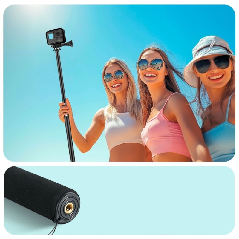 Der Monopod zeichnet sich durch außergewöhnliche Vielseitigkeit aus – er ist mit einer breiten Palette von Geräten kompatibel, wie z.B. GoPro- oder DJI-Kameras, sodass Sie die Welt um sich herum in voller Perspektive festhalten können. Die robuste Konstruktion gewährleistet Stabilität und Sicherheit während der Nutzung, und eine spezielle teleskopische Verriegelung verhindert ein versehentliches Abrutschen der Sektionen. Darüber hinaus sorgt die rutschfeste Oberfläche für einen sicheren Halt, selbst unter schwierigen Bedingungen.
