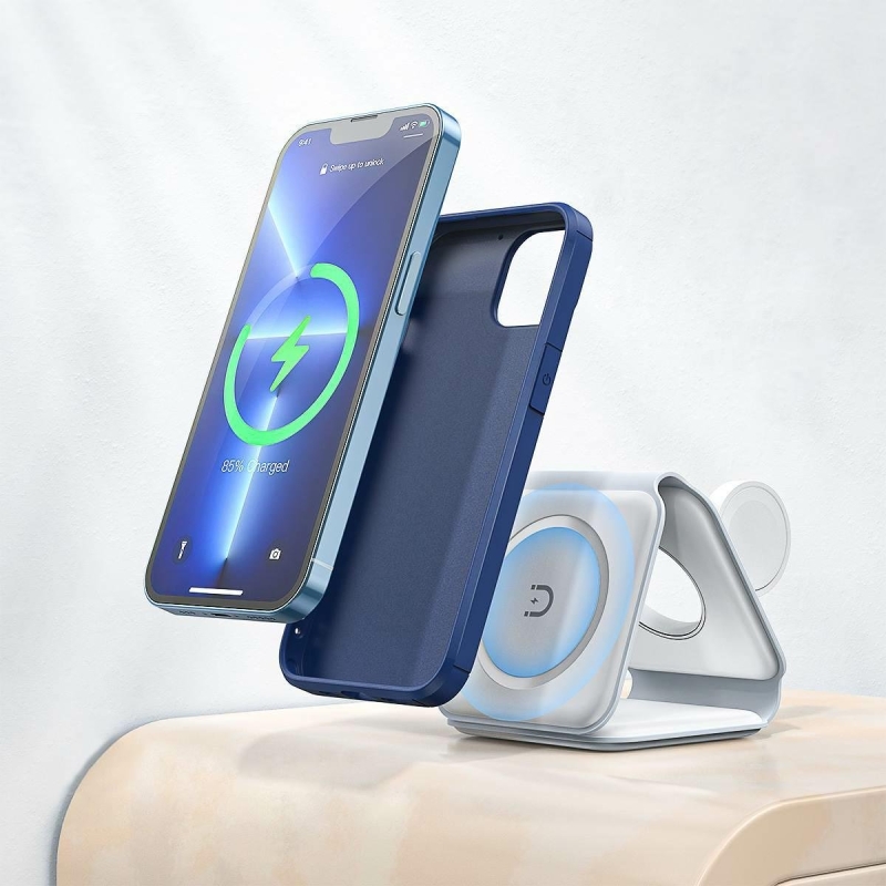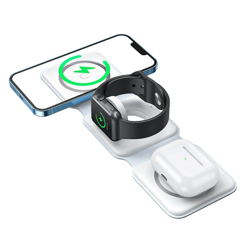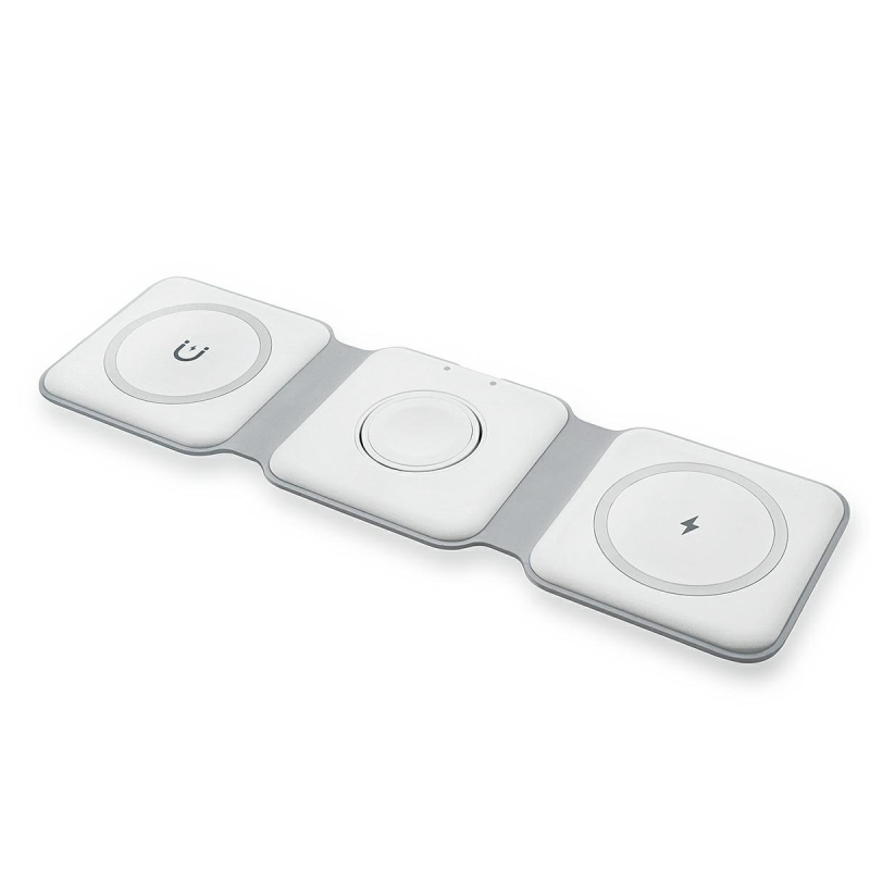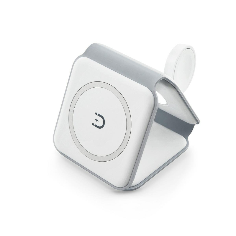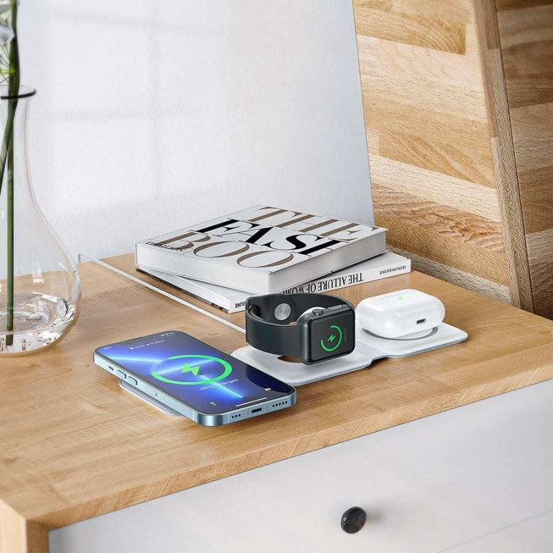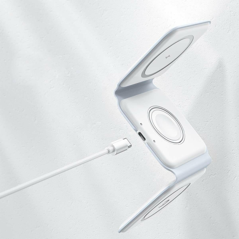Das Ladegerät ist mit 3 Stationen ausgestattet, um Smartphones, Smartwatches und Kopfhörer drahtlos aufzuladen. Es verfügt über einen Type-C-Anschluss zur Stromversorgung.