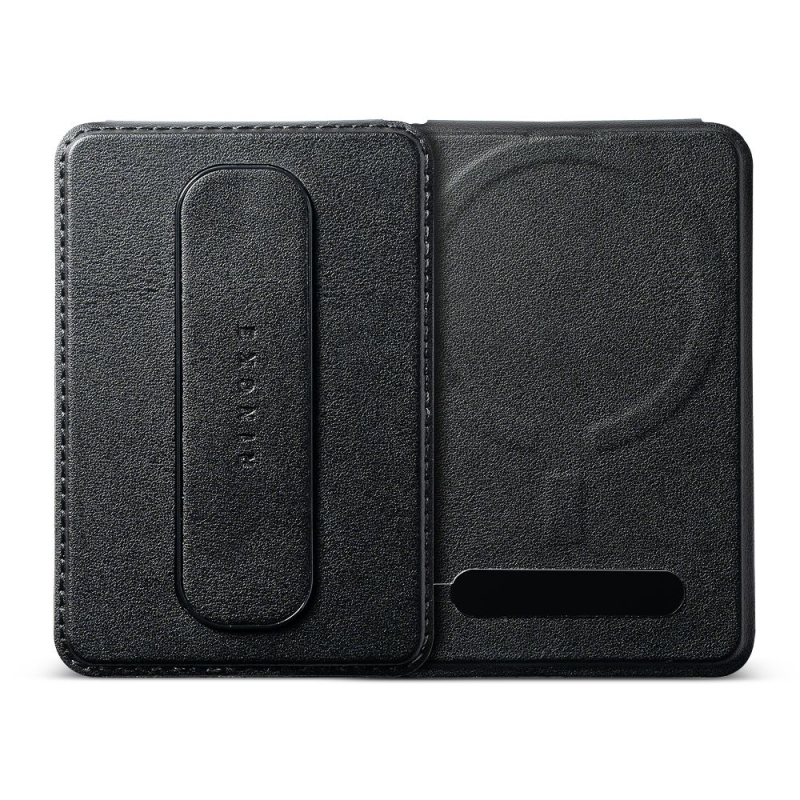 It features a built-in finger strap that slides out with one motion, ensuring a secure grip and ease of use. Additionally, it serves as a stand with an adjustable tilt angle, allowing comfortable viewing of content on the screen. Made from high-quality materials such as PU leather and soft suede lining, it protects stored cards from damage.