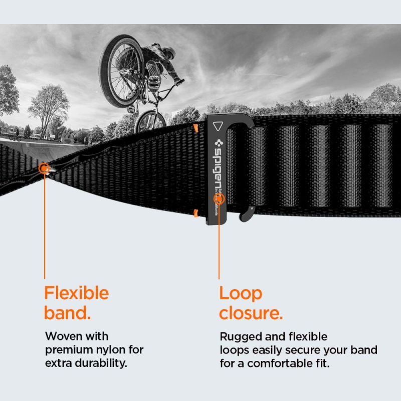 The Spigen WBF1 strap is an elegant and modern accessory made from durable nylon, combining a sporty character with a minimalist style. Equipped with a solid hook buckle and loop closure, it ensures a secure and stable fit during everyday use and intense activities.