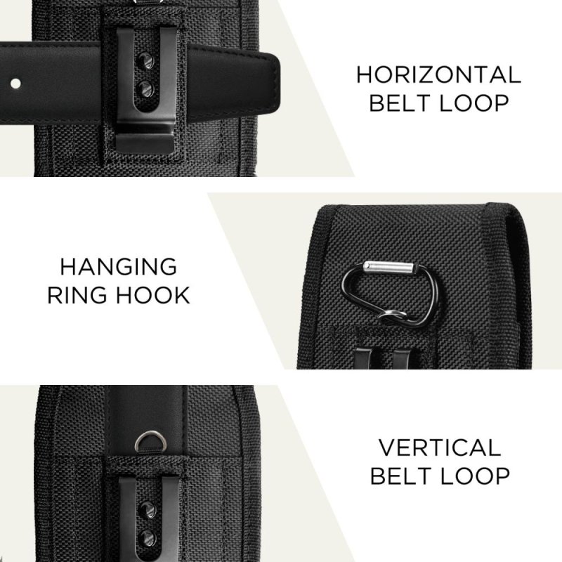 Model SM85 oferuje różne sposoby użytkowania. Podwójnie przeszyte szlufki na pasek umożliwiają etui pionowo lub poziomo, a dodatkowo dołączony metalowy karabińczyk pozwala na przypięcie etui do plecaka, torby lub szlufki spodni. Dzięki temu użytkownik może wybrać najwygodniejszy sposób noszenia dopasowany do swoich potrzeb.