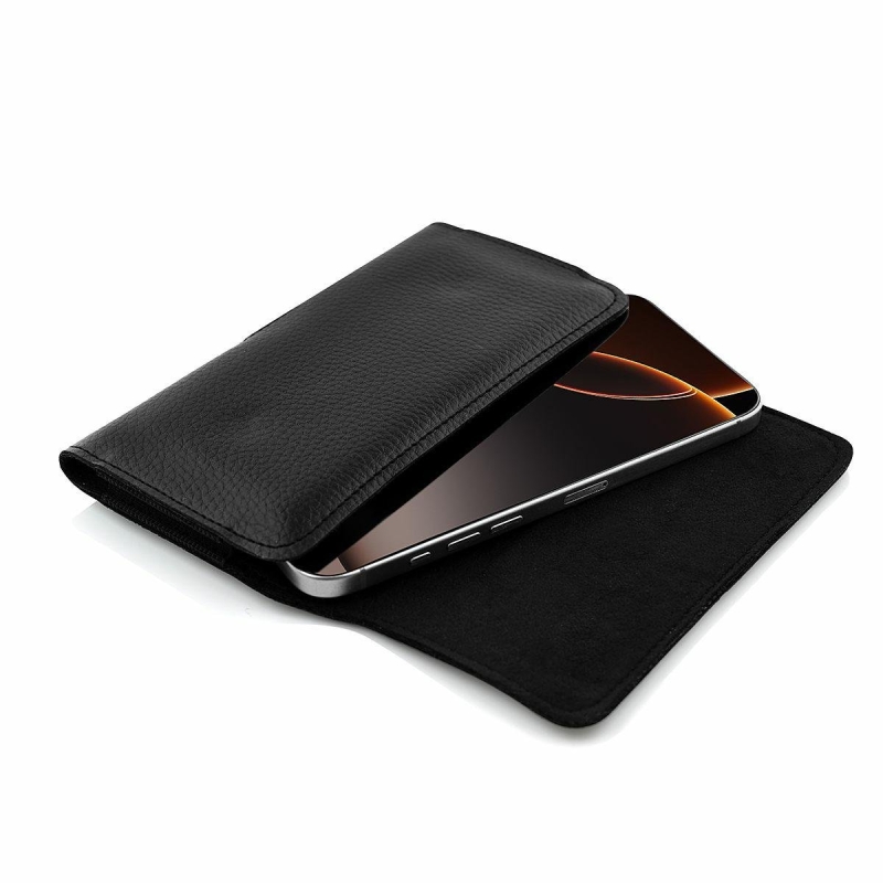 Elegant, horizontal belt holster, made of eco-leather, with a flap that opens upwards.