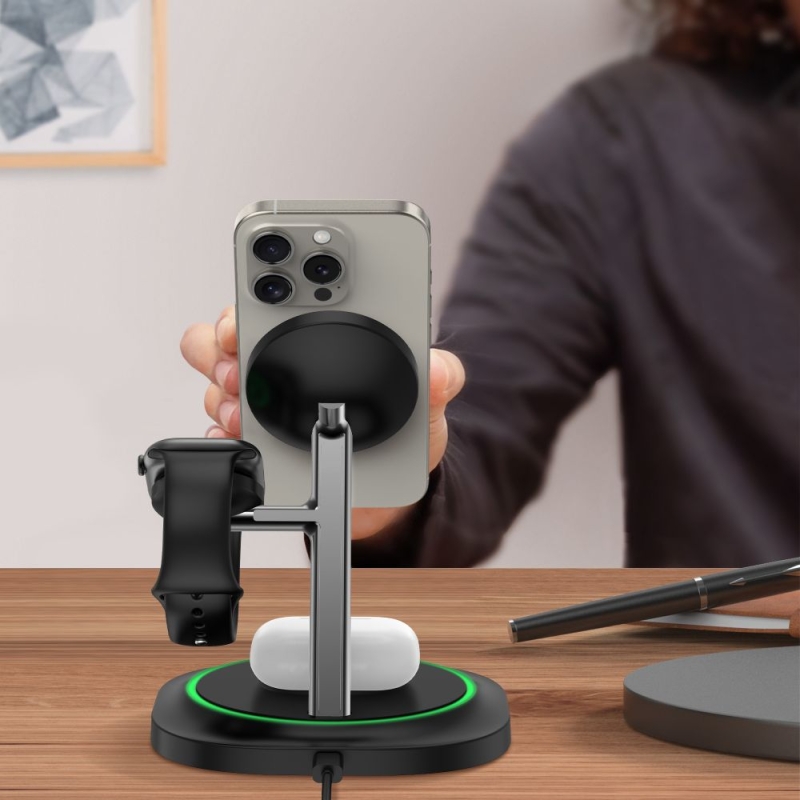 The QI15W-A46 model stands out with its modern design and built-in ambient lighting with the option to choose from 6 colors, which can be switched at will to match the surroundings. Thanks to strong magnets, the phone remains securely attached even in a vertical position, making it easier to use FaceTime or browse content. The charger is compatible with devices that support wireless charging, including MagSafe iPhones, Apple Watches, and AirPods.