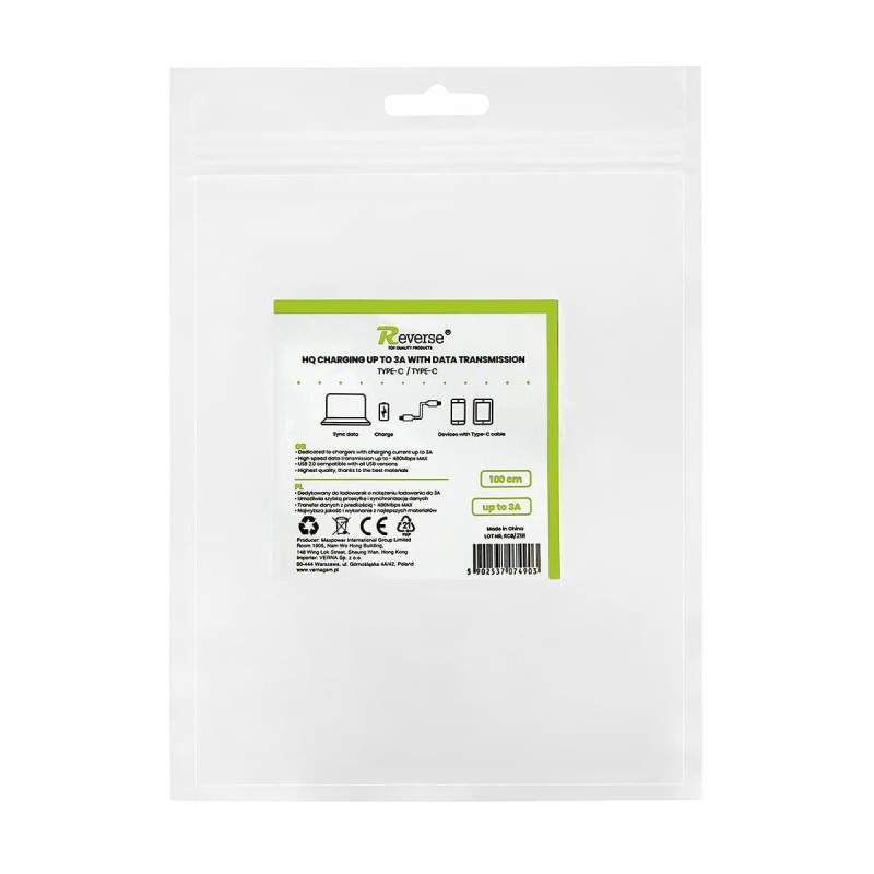 Cable REVERSE Type C/Type C 3A 1m black BAG