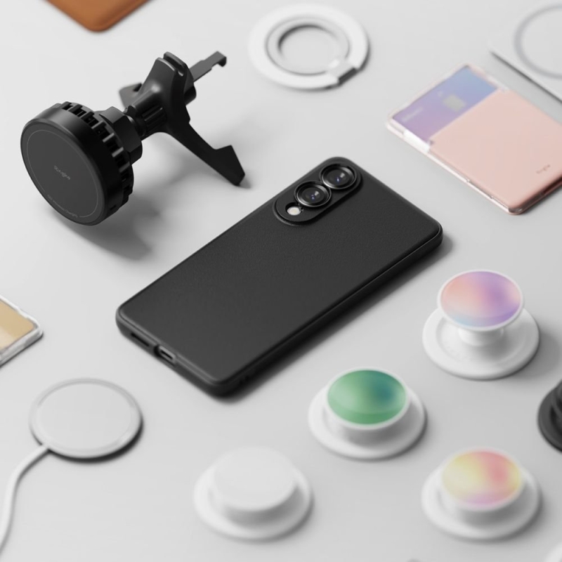 The Onyx Magnetic Magsafe case from Ringke is made of soft and durable thermoplastic material, additionally reinforced at the edges to best protect the device. The slightly raised form of the case around the camera and screen protects it from scratches, lifting the phone just above the flat surface. It features button covers, cutouts for ports, and a lanyard.