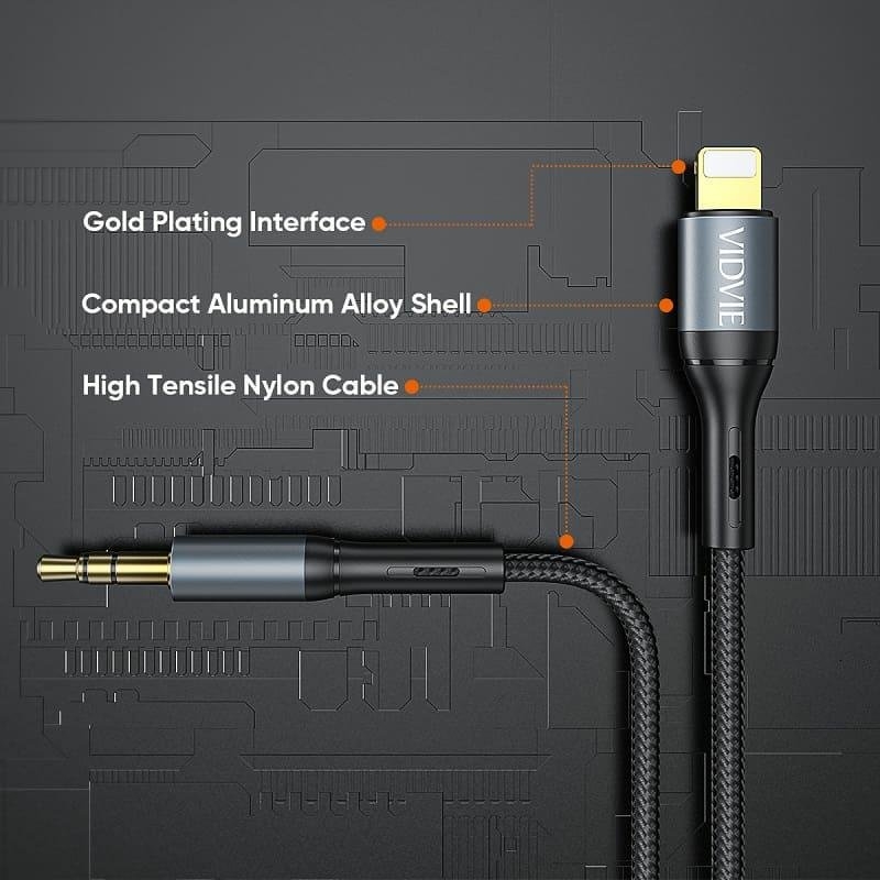The cable is ended with Lightning on one end and a 3.5mm Jack on the other
