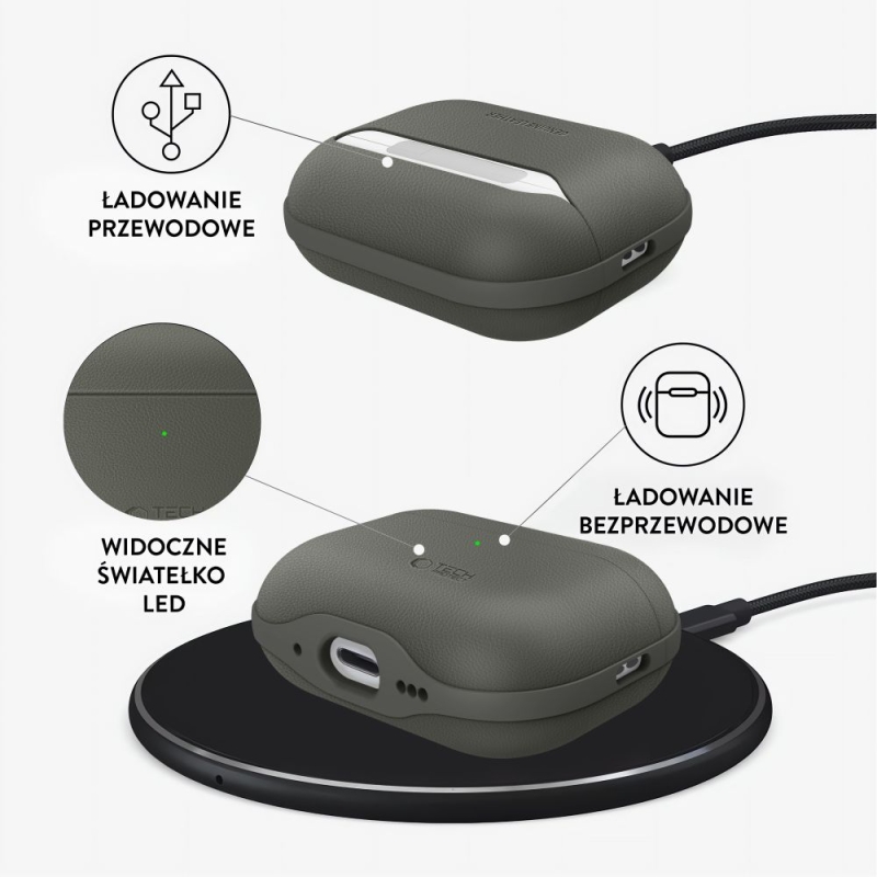 Etui posiada widoczne światełko LED, które umożliwia szybkie sprawdzenie stanu ładowania, a dzięki wsparciu zarówno ładowania przewodowego, jak i bezprzewodowego, użytkowanie jest wygodne i uniwersalne. Wnętrze etui zostało starannie wykończone miękką mikrofibrą, która delikatnie otula słuchawki, zabezpieczając je przed zarysowaniami i kurzem.