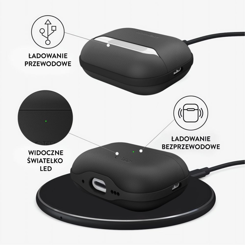 Etui posiada widoczne światełko LED, które umożliwia szybkie sprawdzenie stanu ładowania, a dzięki wsparciu zarówno ładowania przewodowego, jak i bezprzewodowego, użytkowanie jest wygodne i uniwersalne. Wnętrze etui zostało starannie wykończone miękką mikrofibrą, która delikatnie otula słuchawki, zabezpieczając je przed zarysowaniami i kurzem.
